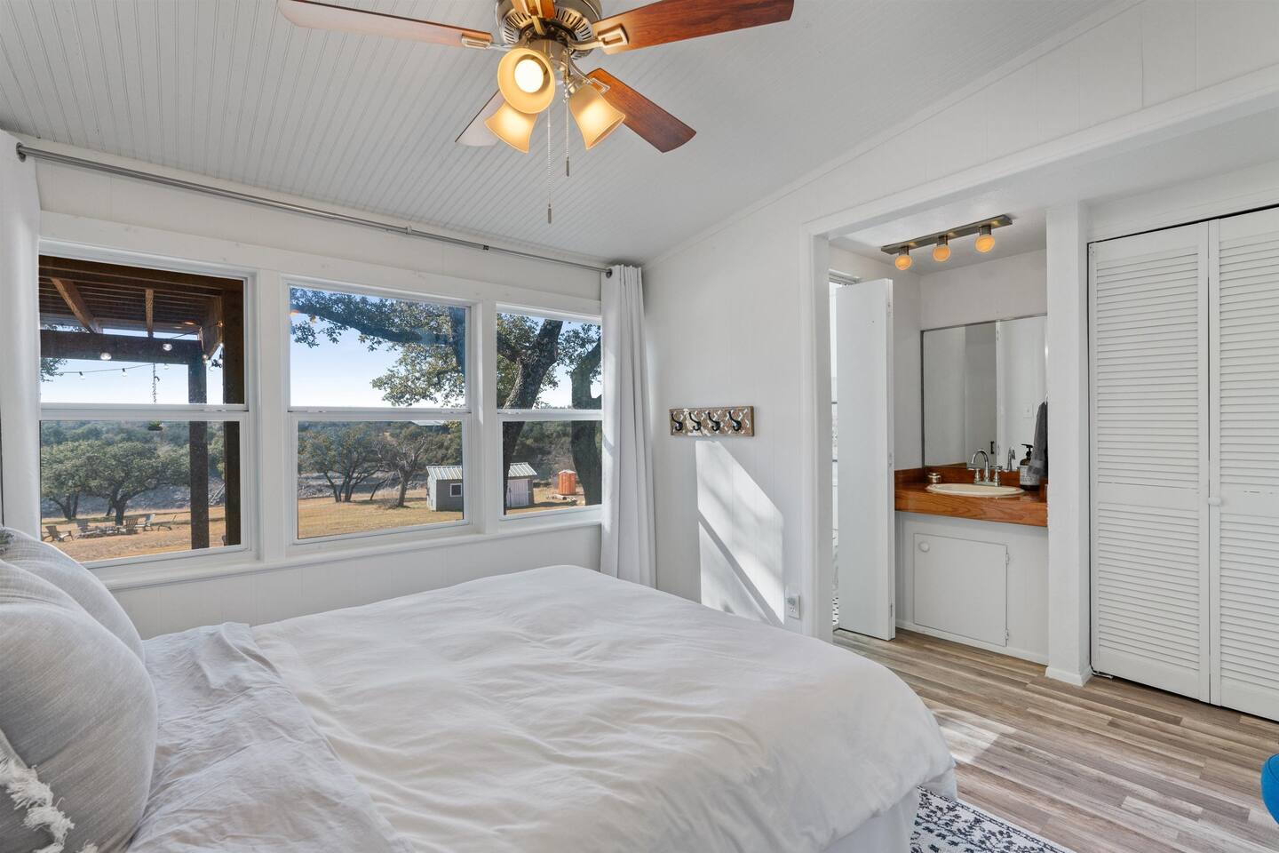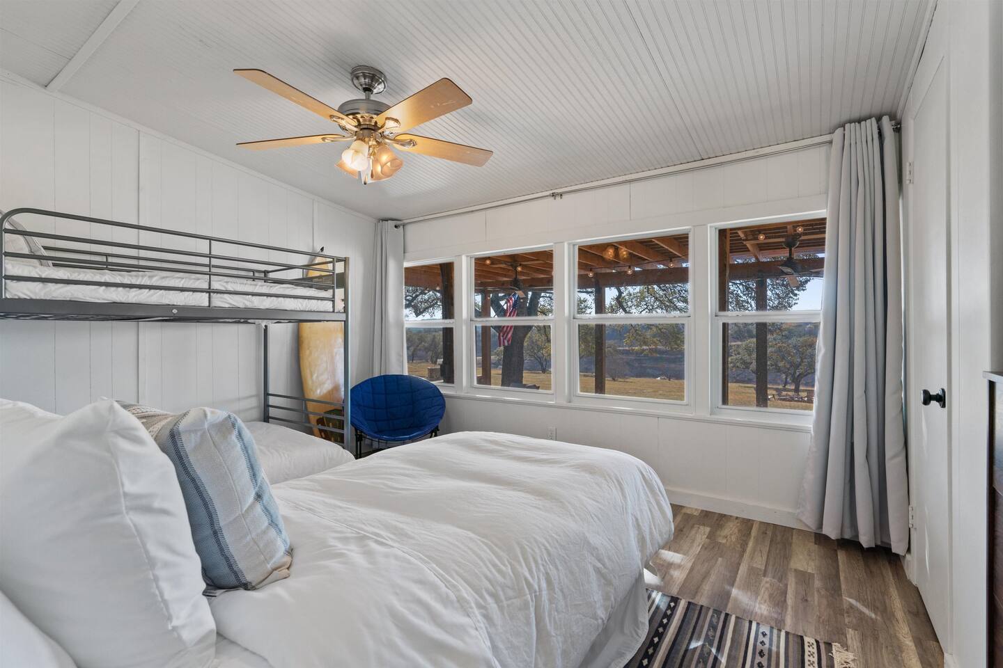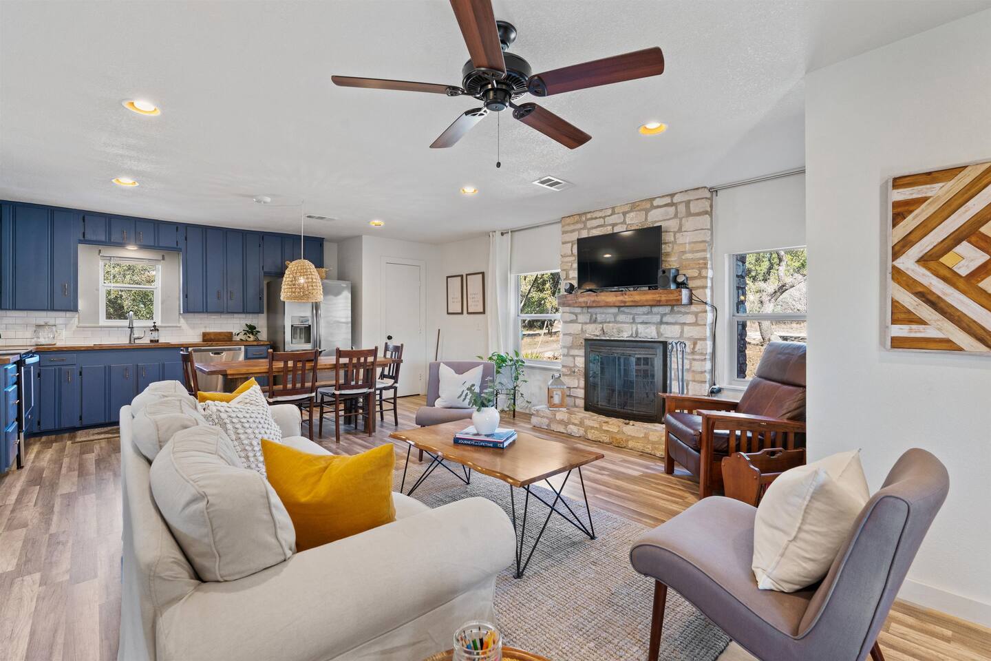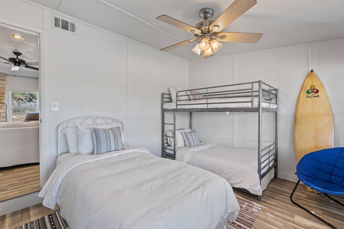 With incredible views of the Texas hills, canyons, and lake, this is the perfect place to host your next vacation or small retreat! Our cozy cottage boasts: ☆ Sweeping views of the Texas hill country and Flat Creek* ☆ Huge wood burning fire fit; BYO s'mores! ☆ Large deck with outdoor dining space and huge outdoor seating area; enjoy sundowner views! ☆ Primary Suite located on its own side of the house for max privacy! King bed and beautiful walk in shower ☆ Secondary room with Queen bed and private 1/2 bath + vanity space (sleeps 2) ☆ Third Room with 2 sets of twin bunk beds, a twin bed and a twin trundle (sleeps 4) ☆ Smart 4K TV with Netflix, Hulu & more! BYO log ins ☆ Super cold AC and cozy heating ☆ Pack n Play, toys & books for the little ones ☆ Tons of games and books for grownups too! ☆ Work space and high-speed wifi so you can "work from home" in the middle of nature ☆ Laundry area with full size washer and dryer ☆ Easy self check-in Don’t take our word for it, come see it for yourself! What to host an event? Contact us for event rates! *We do not currently have a boat ramp available for launching, but you are welcome to bring kayaks, paddle boards or tubes! The lake is open, but please exercise caution when swimming or doing water sports. The owner and management company assume no liability for accidents.