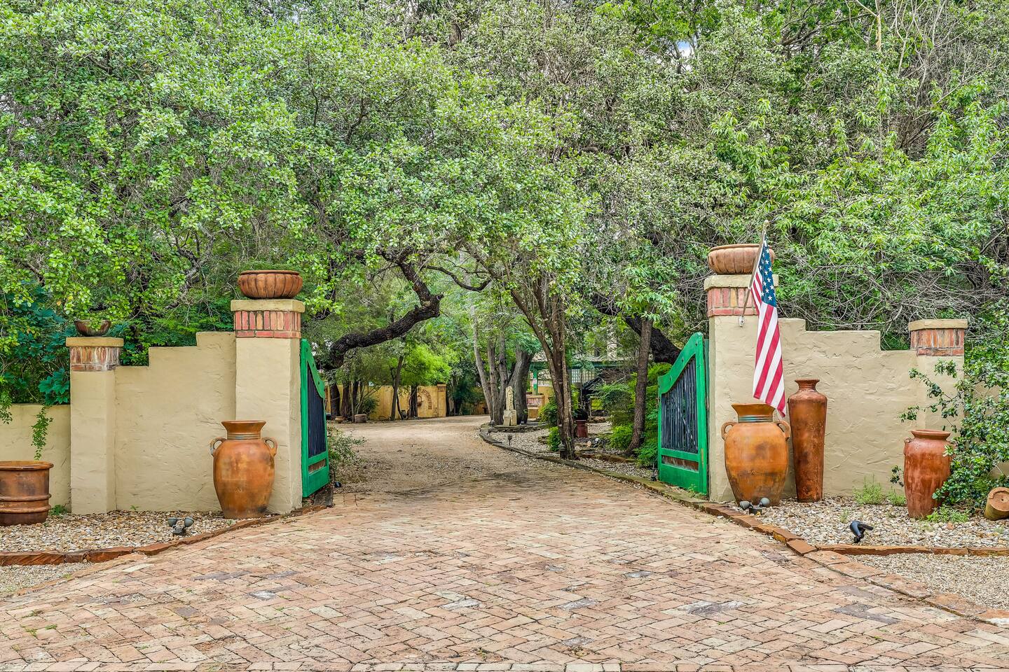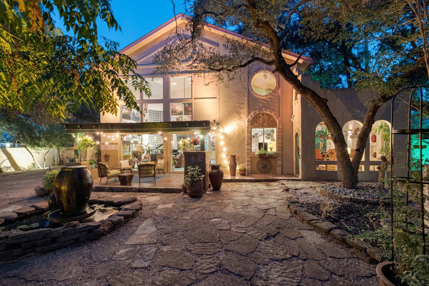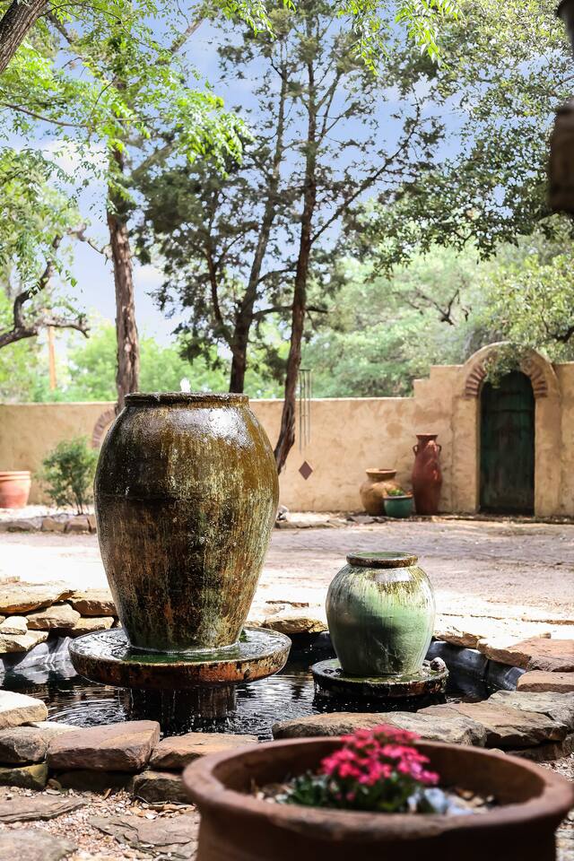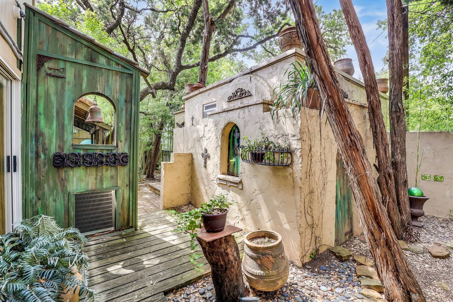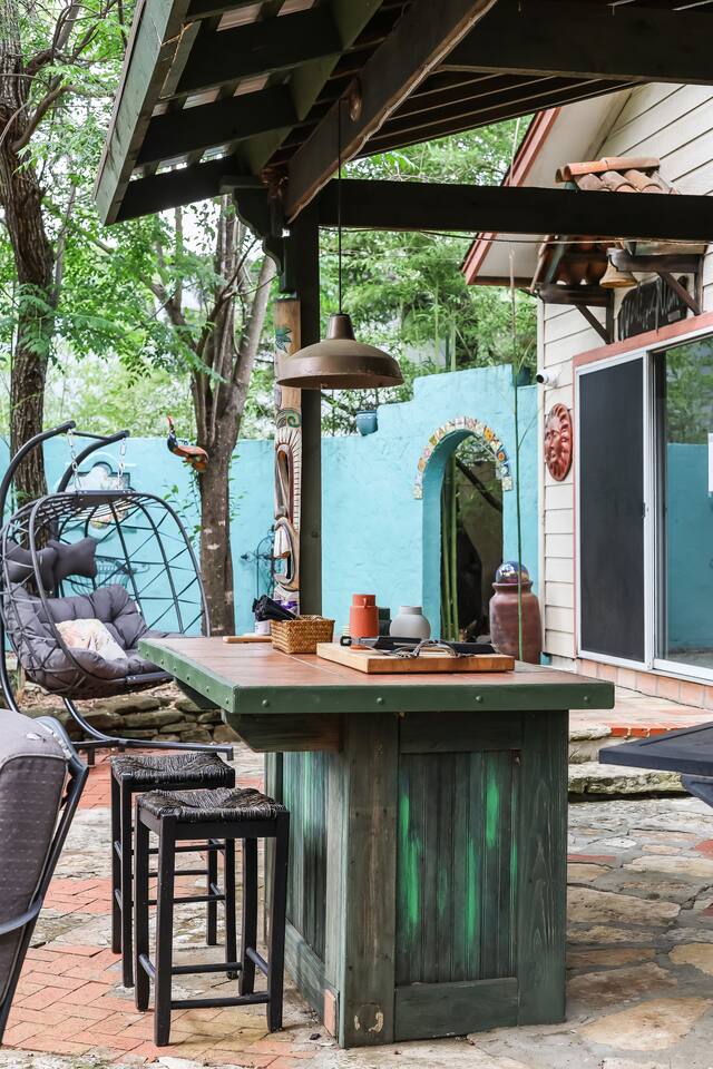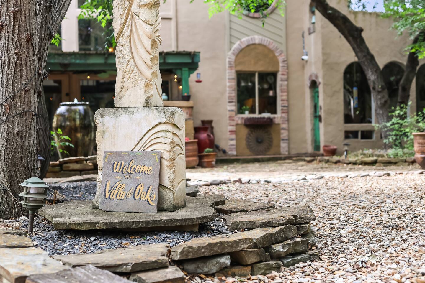 Villa De Oaks is a spacious sanctuary, featuring three bedrooms, two full bathrooms, and a convenient powder room. This unique oasis checks all the boxes for the perfect vacation: ☆ Unique Tuscan-style home nestled in the Texas Hill Country, 5 minutes from Lake Travis! ☆ Beautiful gated property with lush greenery, gorgeous architecture, multiple serene water features & multiple lounging areas ☆ Exclusive deals on chartered boat rentals for all of our guests (reservations needed) ☆ Premium outdoor amenities such as an XL hot tub (6-9 people) and TWO fire pits with plenty of seating ☆ Baby Grand Piano, bongos & a tambourine for our musical guests ☆ Over 40 unique paintings & sculptures by local artists ☆ Game Room with reclining couch, Smart TV and PS and XBOX gaming consoles ☆ Primary bedroom with King bed (sleeps 2) & en-suite bathroom (upstairs) ☆ Second bedroom with one Queen bed (sleeps 2) & en-suite bathroom (upstairs)* ☆ Huge downstairs bunk room with 2 sets of full size bunk beds (sleeps 4-8) & kitchenette ☆ On-site parking with a large lot that can accommodate jet skis or a boat** ☆ Huge lot with tons of mature oaks, perfect for relaxation or exploring ☆ Hassle-free self check-in *Bunk room guests will have easy access to the downstairs powder room, but will have to share the showers with the upstairs ensuite guests. **Standard height boat trailers only. Lifted trucks or taller boat trailers may not clear the oak trees on the property. We are not responsible for damages to boats, trailers or vehicles. Street parking is available if your boat won't clear the trees :)