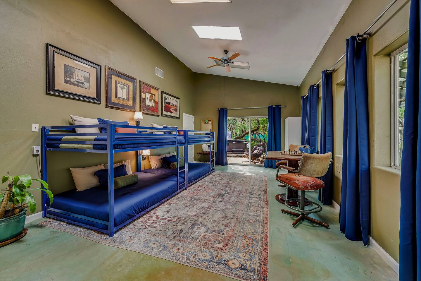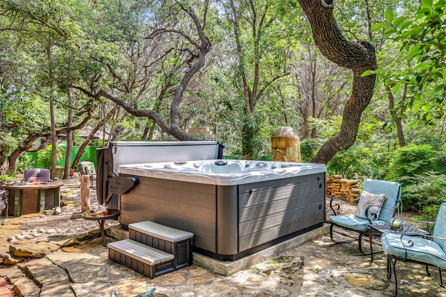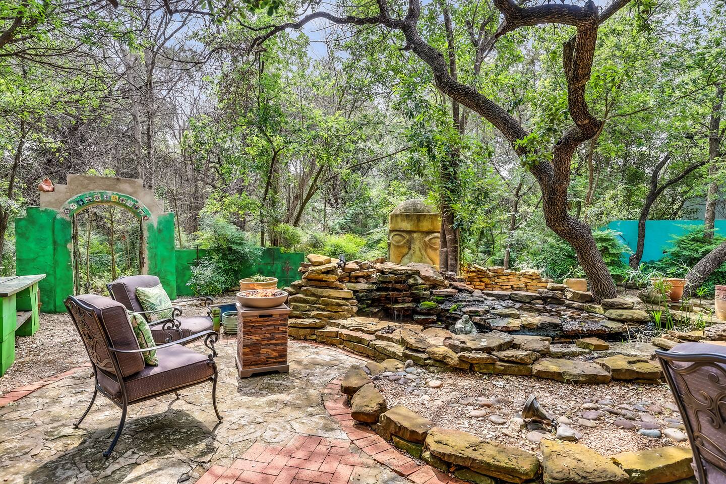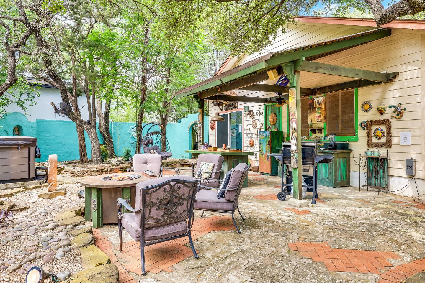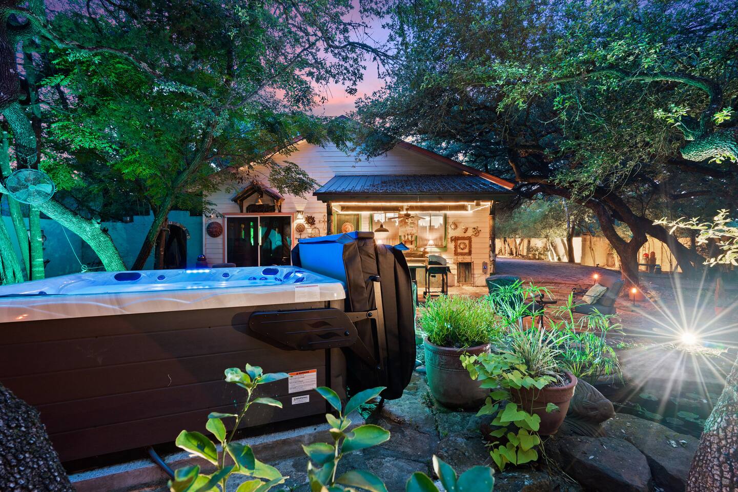 Villa De Oaks is a spacious sanctuary, featuring three bedrooms, two full bathrooms, and a convenient powder room. This unique oasis checks all the boxes for the perfect vacation: ☆ Unique Tuscan-style home nestled in the Texas Hill Country, 5 minutes from Lake Travis! ☆ Beautiful gated property with lush greenery, gorgeous architecture, multiple serene water features & multiple lounging areas ☆ Exclusive deals on chartered boat rentals for all of our guests (reservations needed) ☆ Premium outdoor amenities such as an XL hot tub (6-9 people) and TWO fire pits with plenty of seating ☆ Baby Grand Piano, bongos & a tambourine for our musical guests ☆ Over 40 unique paintings & sculptures by local artists ☆ Game Room with reclining couch, Smart TV and PS and XBOX gaming consoles ☆ Primary bedroom with King bed (sleeps 2) & en-suite bathroom (upstairs) ☆ Second bedroom with one Queen bed (sleeps 2) & en-suite bathroom (upstairs)* ☆ Huge downstairs bunk room with 2 sets of full size bunk beds (sleeps 4-8) & kitchenette ☆ On-site parking with a large lot that can accommodate jet skis or a boat** ☆ Huge lot with tons of mature oaks, perfect for relaxation or exploring ☆ Hassle-free self check-in *Bunk room guests will have easy access to the downstairs powder room, but will have to share the showers with the upstairs ensuite guests. **Standard height boat trailers only. Lifted trucks or taller boat trailers may not clear the oak trees on the property. We are not responsible for damages to boats, trailers or vehicles. Street parking is available if your boat won't clear the trees :)