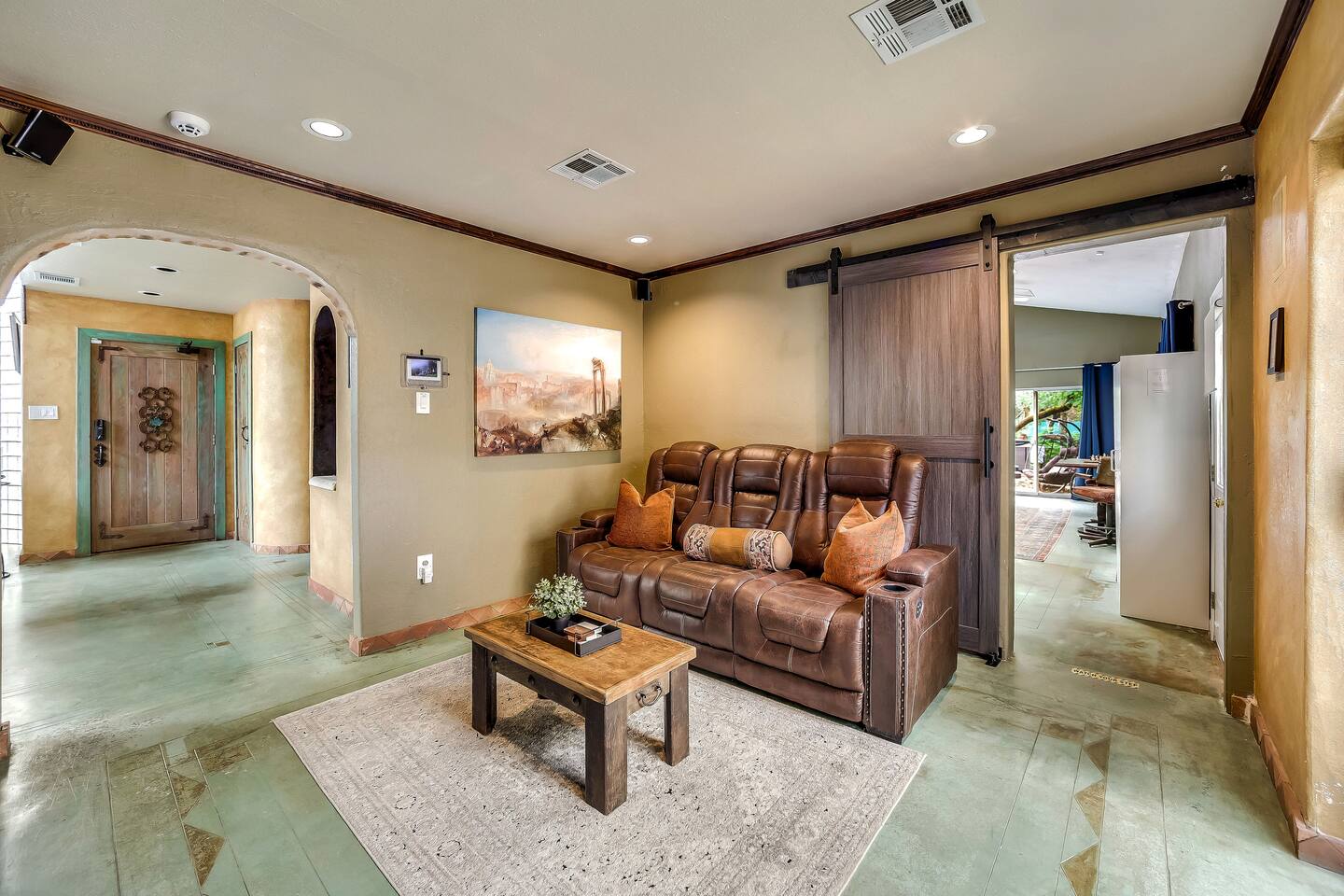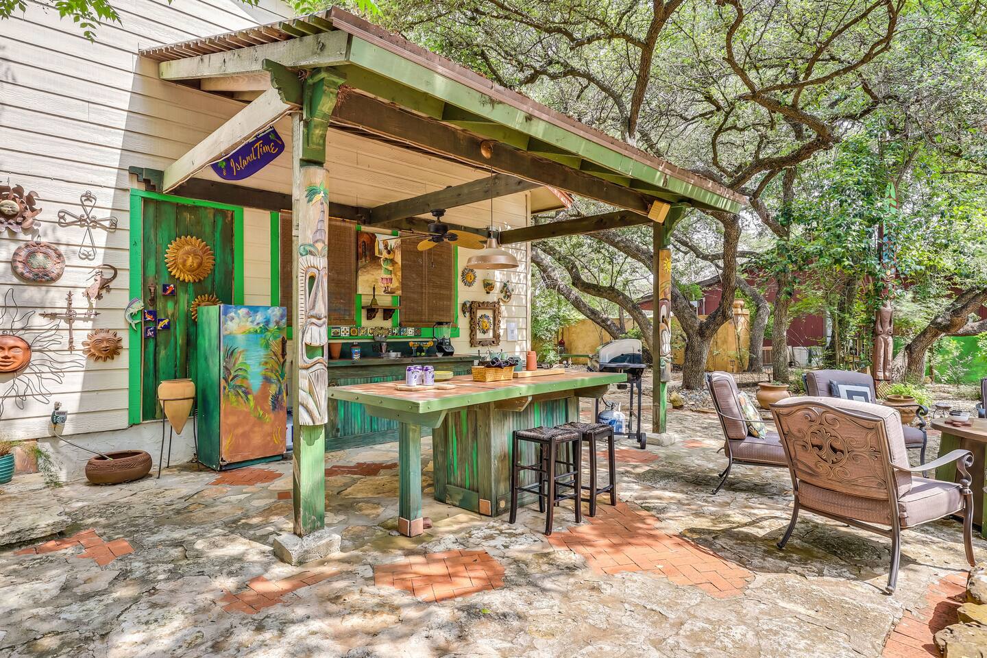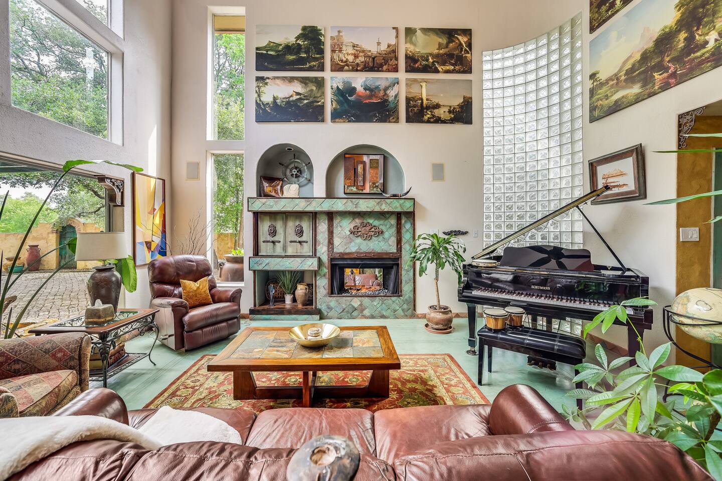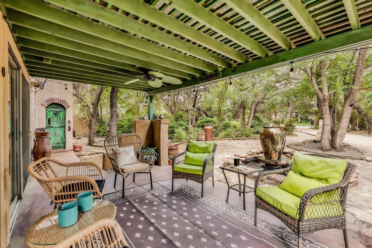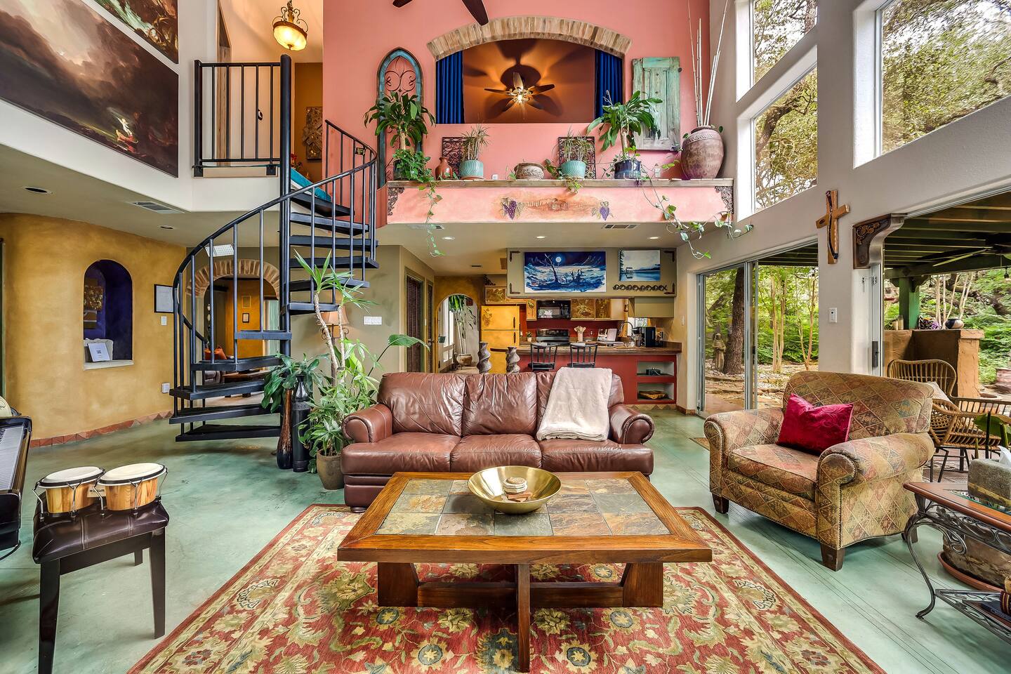 Villa De Oaks is a spacious sanctuary, featuring three bedrooms, two full bathrooms, and a convenient powder room. This unique oasis checks all the boxes for the perfect vacation: ☆ Unique Tuscan-style home nestled in the Texas Hill Country, 5 minutes from Lake Travis! ☆ Beautiful gated property with lush greenery, gorgeous architecture, multiple serene water features & multiple lounging areas ☆ Exclusive deals on chartered boat rentals for all of our guests (reservations needed) ☆ Premium outdoor amenities such as an XL hot tub (6-9 people) and TWO fire pits with plenty of seating ☆ Baby Grand Piano, bongos & a tambourine for our musical guests ☆ Over 40 unique paintings & sculptures by local artists ☆ Game Room with reclining couch, Smart TV and PS and XBOX gaming consoles ☆ Primary bedroom with King bed (sleeps 2) & en-suite bathroom (upstairs) ☆ Second bedroom with one Queen bed (sleeps 2) & en-suite bathroom (upstairs)* ☆ Huge downstairs bunk room with 2 sets of full size bunk beds (sleeps 4-8) & kitchenette ☆ On-site parking with a large lot that can accommodate jet skis or a boat** ☆ Huge lot with tons of mature oaks, perfect for relaxation or exploring ☆ Hassle-free self check-in *Bunk room guests will have easy access to the downstairs powder room, but will have to share the showers with the upstairs ensuite guests. **Standard height boat trailers only. Lifted trucks or taller boat trailers may not clear the oak trees on the property. We are not responsible for damages to boats, trailers or vehicles. Street parking is available if your boat won't clear the trees :)